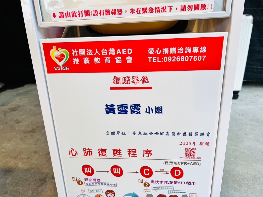 感謝「黃雪霞」小姐捐贈AED至「臺東縣金峰鄉嘉蘭文化健康站」