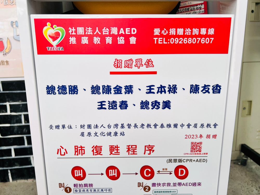 感謝「魏德勝、魏陳金葉、王本祿、陳友香、王遠春、魏秀美」捐贈AED至「南投縣仁愛鄉眉原文化健康站」