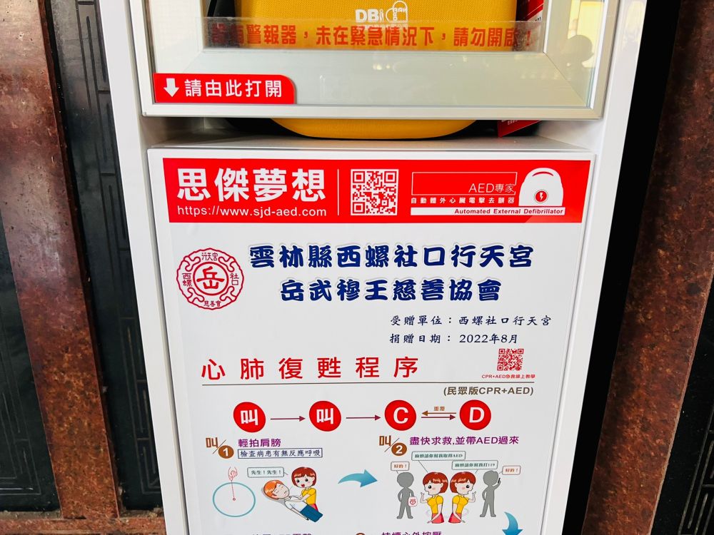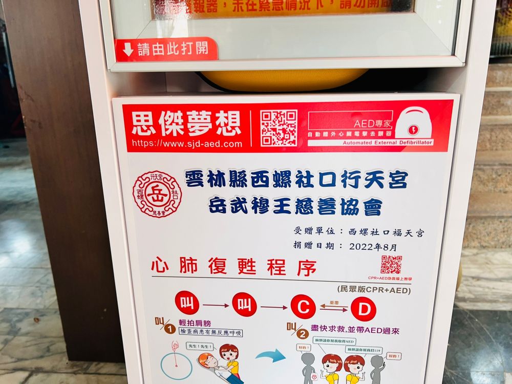 感謝「雲林縣西螺社口行天宮岳武穆王慈善協會」選擇 「思傑夢想」,捐贈至「行天宮」、「福天宮」共二台AED