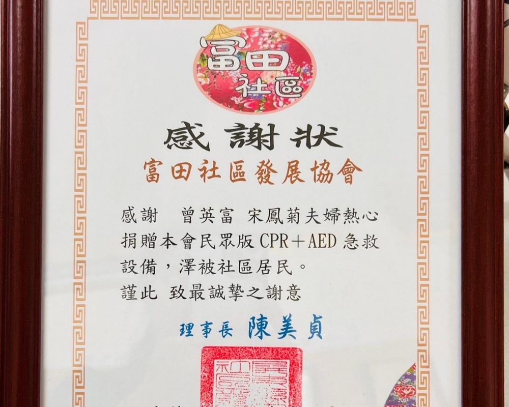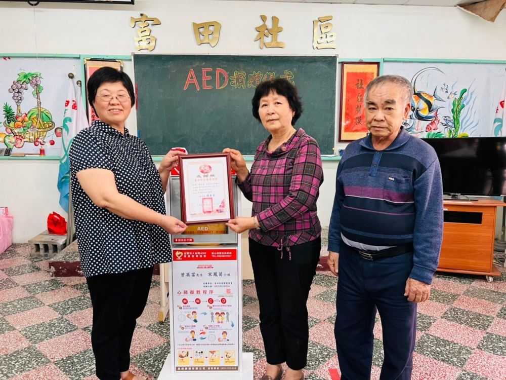 感謝「曾英富、宋鳳菊夫婦」捐贈AED至「屏東縣富田社區發展協會」